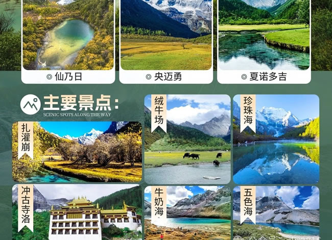 早上:7:00 早餐后乘車經(jīng)波瓦山到達(dá)【亞丁景區(qū)】(門票已含,首次觀光車 120/人自理,必須消費(fèi)),后在游客接待中心換乘景區(qū)觀光車抵達(dá)亞丁景區(qū)【扎灌崩】(40 公里,車程 1.5 小時),下車后游 客徒步上山直接抵達(dá)沖古寺。 中午:景區(qū)中餐自理,觀賞沖古寺風(fēng)光及神山仙乃日風(fēng)光,然后可自費(fèi)乘坐電瓶車(自理往返 70/人,單程 40/人)前往【洛絨牛場】(如徒步需 1-2 小時左右達(dá)到洛絨牛場)。這里是觀【夏諾多吉神山】(意為金剛手菩薩,海拔 5958 米)【央邁勇神山】(意為金文殊菩薩,海拔 5958 米)的最佳地點(diǎn),讓神山圣水與心共鳴,盡情沉醉在夢幻之地,后原路返回,到達(dá)【扎罐崩】乘觀光車返回住宿地。 晚上:回到日瓦鎮(zhèn)或稻城,晚餐后入住酒店。溫馨提示:因當(dāng)天游客出景區(qū)時間不統(tǒng)一,所以旅游車無法統(tǒng)一接送游客,游客可以選擇乘坐當(dāng)?shù)毓卉嚕?-10元/人自理)。亞丁景區(qū)分長線—牛奶海、五色海和短線—珍珠海游覽。長線游覽:因牛奶海和五色海海拔高,客人務(wù)必根據(jù)自身實(shí)際情況選擇是否前往(可選擇自費(fèi)騎馬305元/人至舍身崖約1.5小時,再徒步至牛奶海和五色海需約1.5小時,冬季11中旬至次年3約中旬馬幫停運(yùn),需徒步單程5KM往返10KM,徒步往返時間約4.5小時)到達(dá)【牛奶?!浚偻讲角巴疚迳!浚ㄍ讲郊s20分鐘);【牛奶?!亢0?800米,又叫洛絨措,古冰川湖,狀如水滴,四周雪山環(huán)繞,湖水清瑩碧藍(lán),山止成瀑,以其玲瓏秀雅水色翠藍(lán)而著名。牛奶海在央邁勇的山坳里,呈扇貝形,中間是碧藍(lán)的雪水,周邊則是一圈乳白色環(huán)繞,這圈乳白色大致就是牛奶海名稱的由來。牛奶海是美麗的,遠(yuǎn)遠(yuǎn)望去,仿佛碧玉鑲嵌在雪山之中,純凈安詳。純凈的湖水給人以平和安寧的心境,而藍(lán)湛湛的海子并不透明,顯得神秘莫測。傳說能治聾啞病的圣湖。【五色?!亢0?600米,由于光的折射下,產(chǎn)生五種不同顏色而得名:其真名為“登崇措”。五色海它位于仙乃日與央邁勇之間,湖面呈圓形。面積0.7公頃,現(xiàn)代冰谷下伸至湖畔,雪山倒影湖面,呈現(xiàn)奇幻的色彩。是藏區(qū)著名的圣湖(佛經(jīng)中贊譽(yù)該湖與西藏羊巴雍措齊名),據(jù)傳能“返演歷史,預(yù)測未來”。短線游覽:游客可乘坐景區(qū)觀光車抵達(dá)扎灌崩,徒步500米到達(dá)沖古寺,前往仙乃日神山下的圣湖【珍珠?!慷叹€游覽(單程約1.5KM,徒步前往約40分鐘),海拔3950米?!菊渲楹!吭诓卣Z中稱為“卓瑪拉措”,是仙乃日的融雪形成的海子。面積約0.1平方公里。密林中的珍珠海如一顆鑲嵌在蓮花寶座上的綠寶石,碧波蕩漾,粼粼波光中透出無限清麗,湖畔四周,參翠如屏。春天湖邊片片杜鵑花燦爛怒放,秋天層林盡染,倒影著五彩斑斕的世界,令人目眩神迷。【亞丁景區(qū)】以仙乃日、央邁勇、夏諾多吉三座雪峰為核心區(qū),北南向分布,三座雪山呈品字形,三峰藏名為“念青貢嘎日松貢布”,意為“三怙主雪山”,是眾生朝圣積德之所在地。由于特殊的地理環(huán)境和自然氣候,形成了獨(dú)特的地貌和自然景觀,是中國保存最完整的一處自然生態(tài)系統(tǒng)。