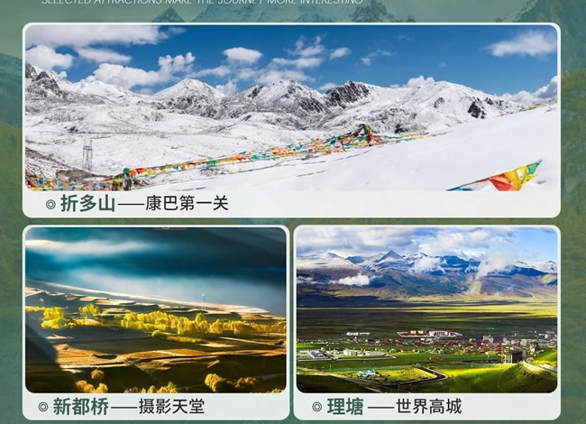 早上:集合地點(diǎn)統(tǒng)一出發(fā),出發(fā)時間以師傅/導(dǎo)游通知為準(zhǔn),從成綿高速、成雅高速經(jīng)雨城【雅安】(以雅女、雅魚、雅雨三絕而聞名是川藏、青藏的咽喉,也是古南方絲綢之路和茶馬古道的門戶必經(jīng)之路)。下高速后沿秀美青衣江而上,觀青衣江河谷風(fēng)光。中午:經(jīng)雅康高速一路向西,經(jīng)過【二郞山】隧道,欣賞“一山有陰陽”的兩種截然不同的奇觀,遠(yuǎn)眺大渡河風(fēng)光(川西最大最深峽谷),后經(jīng)情歌故鄉(xiāng)【康定】午餐,海拔 2560 米。然后乘車前往有小九寨之稱的4A級風(fēng)景區(qū)-【康定情歌風(fēng)景區(qū)】(又名木格措風(fēng)景區(qū),門票贈送,觀光車90元/人自理,必須消費(fèi)), 它坐落于貢嘎山脈中段,附近有其他多個高山湖泊和溫泉,原始森林,草原和雪山景觀互相交融。景區(qū)由木格措圣湖、杜鵑峽、藥池沸泉、七色海、芳草坪等景點(diǎn)組成。木格措湖景色一日多變,清晨坦面無垠的湖面靜如鏡面,倒映著雪峰和群山;午后波濤滾滾,濤聲如雷震撼山谷;傍晚夕陽西斜時湖面金光燦爛奪目。動靜交替的湖水,日變?nèi)f千。在此還可觀賞到“猛虎臥山”、“觀音鎮(zhèn)?!钡绕婷钌骄啊T诓煌竟?jié)還可欣賞“雙霧墜?!薄ⅰ澳靖裣φ铡?、“木格漲潮”和迭瀑飛泉等云、霧、霞、水奇觀;在珍珠灘可享受沙浴、日光浴之樂。海濱可享沙浴、日光浴之樂,湖中可乘坐游船(游船66元/人、游客可以根據(jù)自身情況自費(fèi)乘坐游覽)。七色海是一處湖水與溫泉交融的高原湖泊,杜鵑峽是木格措景區(qū)的走廊,藥池沸泉泉眼數(shù)十個,景區(qū)以高山湖泊及溫泉為主要特色,融原始森林、草原、雪山為一體,互相映襯,一派原始古樸而幽靜的自然景色。木格措圣湖是川西北最大的高山湖泊之一,整個風(fēng)景區(qū)以圣湖、溫泉、雪山、草原、彩林、瀑布為主要特色,一派原始古樸而幽靜的自然景色,使人們仿佛置身于“瑤池仙境”。后翻越有“康巴第一關(guān)”的塞外屏障【折多山】,最高峰海拔 4900 米,埡口海拔 4298 米,也是川藏線上第一個需要翻越的高山埡口。至令人神往的“光與影的世界”“攝影家的天堂”【新都橋】。晚上:晚餐后入住新都橋/雅江酒店。游客若有需要可自行前往網(wǎng)紅打卡景點(diǎn)-【魚子西】(參考價格:小車擺渡費(fèi)60-80/人+清潔費(fèi)30/人請自理)屬于木雅貢嘎地區(qū),擁有以藏傳佛教為基礎(chǔ)的基本文化特征,項目范圍內(nèi)可 360 度遙望藏區(qū)四大神山之一藏區(qū)“第二香巴拉”的雅 拉神山全貌和四川最高峰“蜀山之王”的木雅貢嘎大雪山山系全貌,為貢嘎西坡地區(qū)難得的觀景攝影點(diǎn)。后帶著愉悅的心情乘車返回有攝影天堂之稱的【新都橋】。